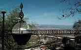 Detail of light fixture and inscription. The fixture was an antique street lamp, here turned upside down and fitted to the railing. The view is across the Verde Valley toward Sedona, some twenty-odd miles away. Such a magnificent view gives one pause to reflect on the immensity of the Arizona landscape and one's place in the world. The inscription was inspired by this environment and is rendered in Germanic runes. It transliterates, "Tend your world as a garden". |