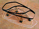 Shot during construction. The top is hand bent steel strap, 1/8" x 1-1/2"; the base is 5/16" rod. The table measures about 22" x 42". The outer white outline on the ground marks the glass top to be furnished by the owner. |